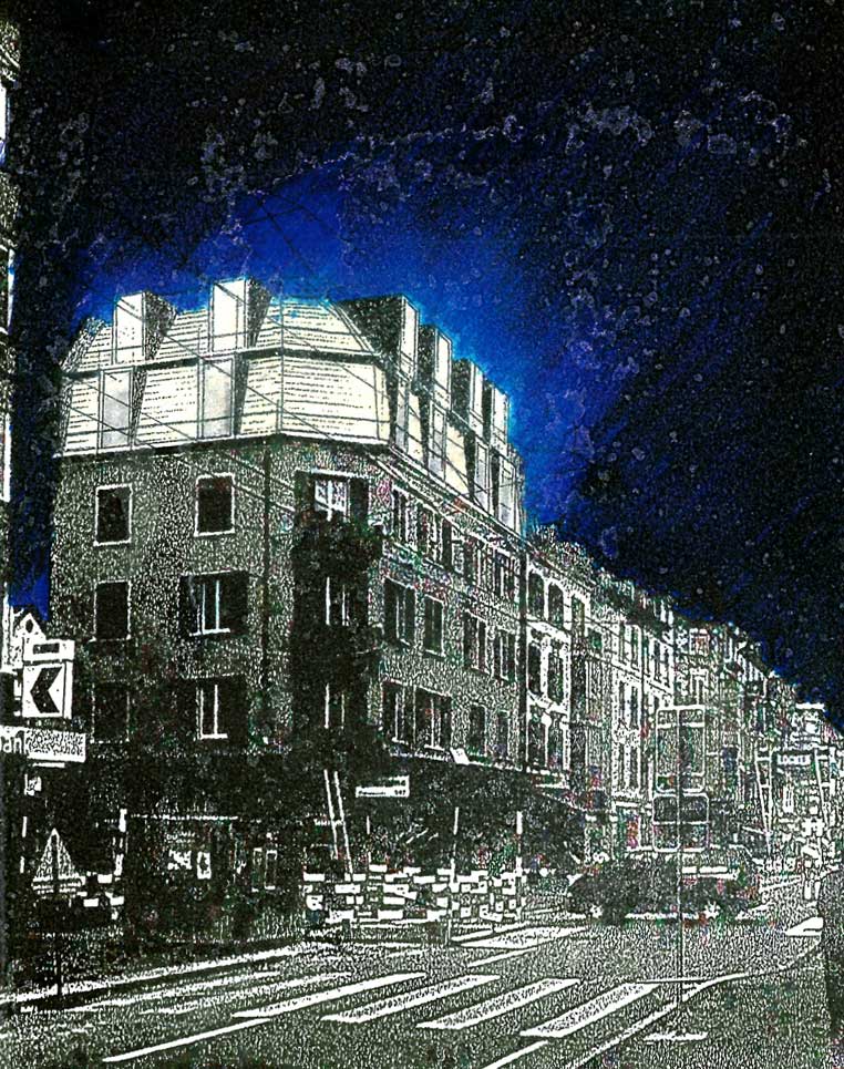 Die bestehende Bausubstanz soll für die Aufstockung möglichst unverändert bleiben. Die Logik der bestehenden Grundrisse wird nach oben weiter geführt. Gestalterisch wird die Aufstockung zu einem neuen, städtischen Mansardendach, das sich als leuchtender Kristall über dem bestehendem Gesimse präsentiert.