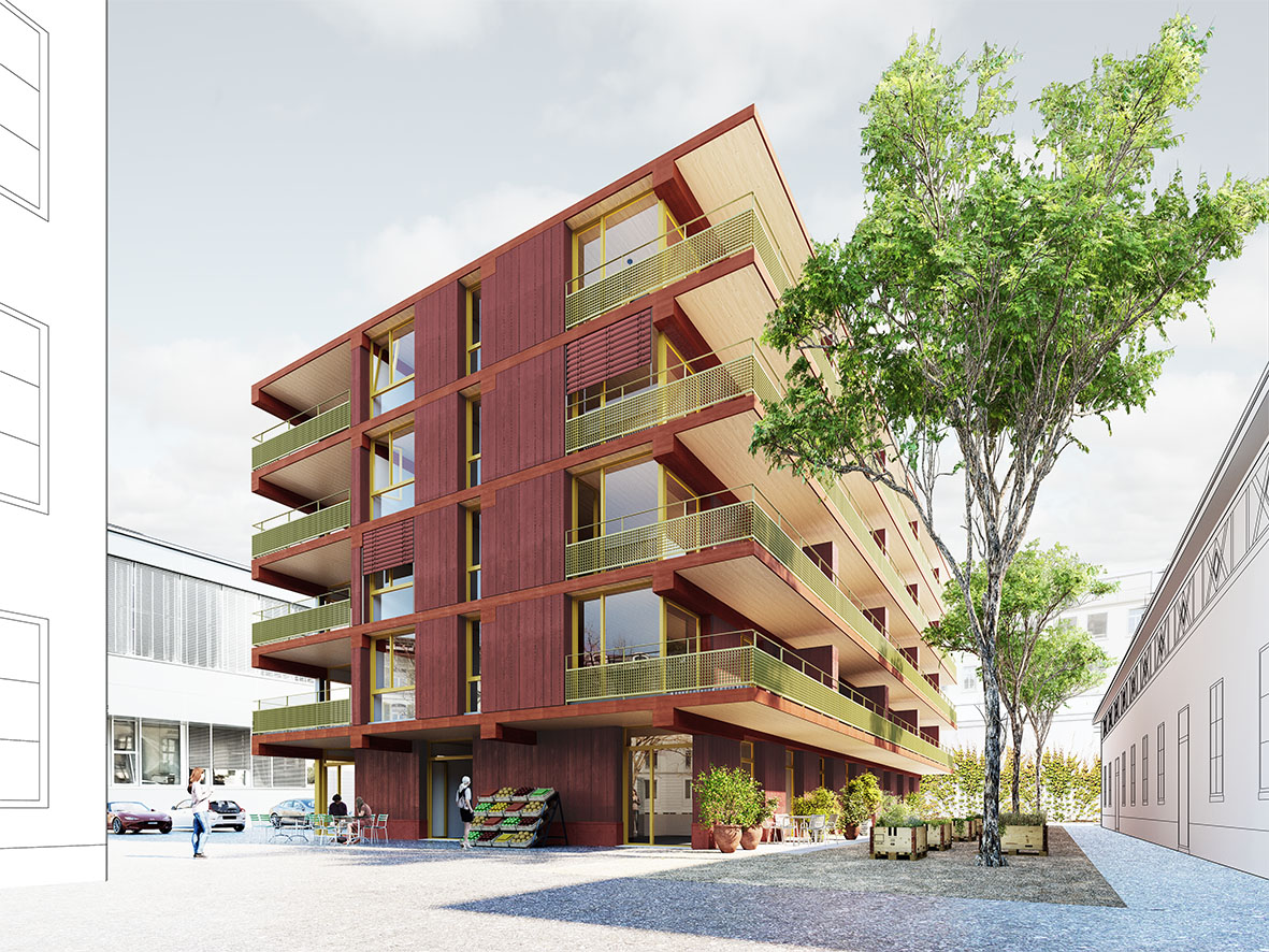 Holzhaus auf dem Areal der ehemaligen Textilfabrik Kunz in Windisch AG Auftraggeberin: HIAG Immobilien AG, Zürich Gesamtleistungswettbewerb 2021 Totalunternehmer: Hector Egger Gesamtdienstleistung AG, Langenthal 28 Kleinwohnungen Verkaufsräume, Wohnateliers Hauptnutzfläche Wohnen: 1’760m2 Bausumme BKP 1-5: 9.9 Mio. CHF