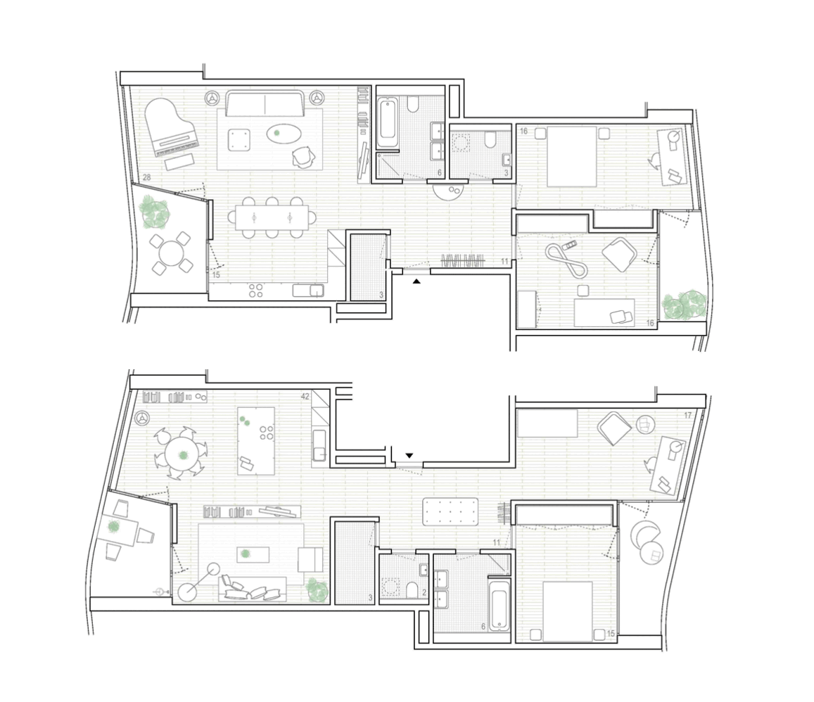 Das langgezogene Gebäude (Steiner AG) bietet allen Wohnungen einen weiten, gleichwertigen Ausblick in den Flussraum und auf der anderen Seite in den Hofraum. Im Erdgeschoss führt die Erschliessung hofseitig entlang den Nebenräumen zu den zweigeschossigen Eingängen. Auf der Flussseite finden sich die Duplexwohnungen, die im ersten Obergeschoss wiederum an beiden Aussenräumen Anteil haben. Die Geschosswohnungen spannen sich zwischen den beidseitigen Balkonen auf und zeichnen sich durch einen fliessenden Innenraum aus, der interessante räumliche Bezüge über die gesamte Tiefe des Grundrisses zulässt und je nach Bewohnerschaft verschieden interpretiert (geplant) werden kann. Das Gebäude zeichnet sich im Innern durch eine sehr einfache, sich wiederholende, Baustruktur aus, die im Äussern von einem umlaufenden und gewellten Brüstungsband gefasst wird. Mit wenigen wiederkehrenden Bauteilen wird eine Fassade mit starkem Ausdruck und angenehmer Ausstrahlung gesucht.