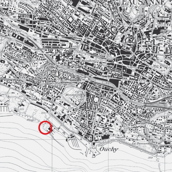 La rive du lac, entre Ouchy et Vidy, s’est considérablement transformée au cours du temps; le lac a notamment été repoussé au moyen de remblais. Le long de la rue de Rhodanie, devant la place de Bellerive et sur le môle juste devant le chantier naval, des lignées d’arbres disposées comme des anneaux de croissance marquent les étapes de l’évolution du terrain. C’est entre ces lignées végétales que se côtoient les différents espaces: la place de Belleville – utilisée tantôt comme place du cirque, tantôt comme lunapark et tantôt pour des places de stationnement – la piscine, le chantier naval et le terrain triangulaire du futur musée s’avançant dans le lac. À l’avant de ce terrain recouvert de roseaux, se trouve le bâtiment du musée. Comme un coquillage échoué sur le rivage, il témoigne d’une relation étroite entre la berge et le lac tout en gardant et protégeant son contenu précieux.