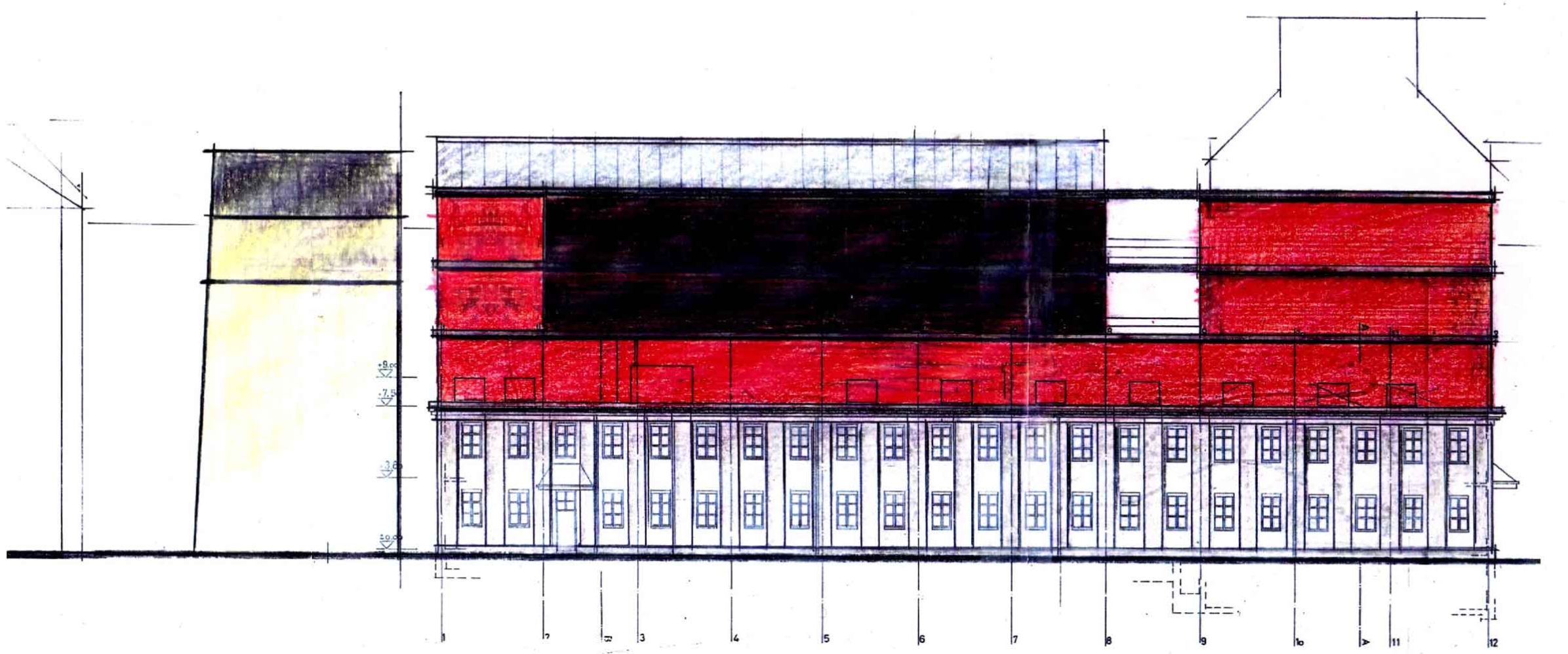 Das zweigeschossige Gebäude an der Roggenstrasse 5 bietet ein grosses Verdichtungspotential. Vorgeschlagen wird, das bestehende Gebäude als Schulhaus für die angrenzende Gewerbeschule weiter zu nutzen. Die darüber liegende Aufstockung soll als Holzskelettbau erstellt werden und kann flexibel mit Büros oder Wohnungen ausgebaut werden. Zusammen mit einem seitlichen Wohnneubau entsteht ein quartiertypisches, vielfältiges Gebäudekonglomerat.
