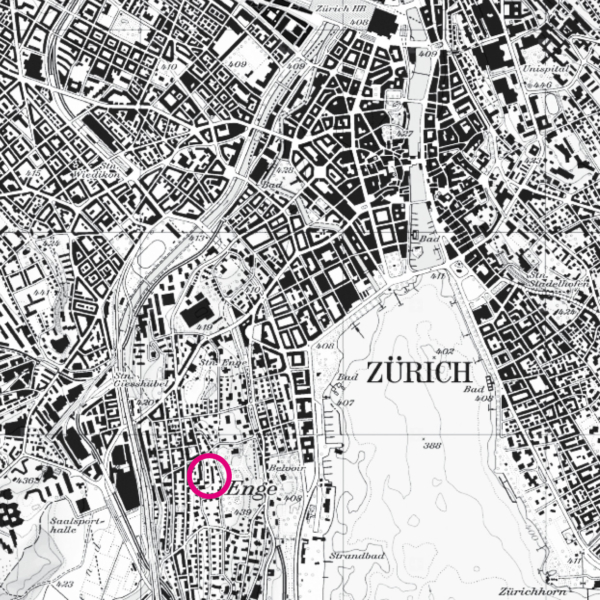 Der Perimeter besteht aus zwei städtebaulich verschiedenen Situationen: Die Scheideggstrasse führt in erhöhter Lage entlang des Rieterparks durch das Quartier. Während hangseitig der mächtige Baumkörper des Parks eine geschlossene Front bildet, sind die Bauten auf der Talseite als Kette von Einzelbauten angeordnet, so dass durch die Zwischenräume immer wieder Ausblicke über die tiefer liegende Bebauung in Richtung Üetliberg entstehen. Die Steinhaldenstrasse wird in unserem Abschnitt ab der Gablerstrasse auf der Westseite durch eine homogene, aber gestaffelte und verspielte dichte geschlossene Bebauung gefasst, um schliesslich auf einem urbanen Plätzchen am Haus „zum Brunnen“ zu enden. Das städtebauliche Ensemble wurde auf unserer Parzelle nicht weitergeführt, sondern fand ihr Gegenüber in der heutigen etwas banalenÜberbauung mit ihren Einzelbauten. Die Strasse wird beidseitig durch klassische städtische Elemente wie Trottoirs, Mäuerchen mit Zäunen und Hecken sowie speziell ausgebildeten Hauszugängen begleitet. Ein überbauter Durchgang bildet die Zufahrt zum westlichen Innenhof.