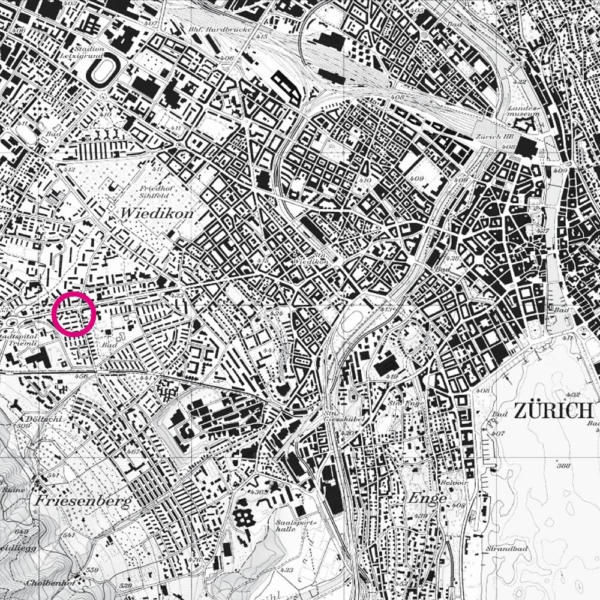 Die lockere, über die Jahrzehnte im Triemliquartier gewachsene Bebauungsstruktur wird in verdichteter Form fortgesetzt. Entlang der beiden stark befahrenen Strassen setzen zwei lange Gebäudekörper einen neuen Akzent und schirmen den Hofraum der Siedlung ab. Die unterschiedliche, städtebauliche Wichtigkeit der beiden Strassenräume kommt in verschieden hohen Gebäudekörpern zum Ausdruck. Nach dem Umbau zur Allee wird die Birmensdorferstrasse zur städtischen Achse, die nach entsprechend starken Gebäuden verlangt. Die Hauptschnittstelle zum städtischen Raum liegt an der aufgebrochenen Ecke bei der Kreuzung der beiden Strassen. Von dort gelangt man über eine diagonale Hauptverbindung in einen parkartigen Hofraum. Diese Wegverbindung schafft auch die Beziehung zum Neubau der Genossenschaft Rotach und zur Paul Clairmont-Strasse. Der Hof wird geprägt durch fünf gleichfalls unterschiedlich hohe Punkthäuser, die einerseits Bezug nehmen zur bestehenden, aufgelockerten Bebauung in der unmittelbaren Umgebung. Anderseits sorgt die gestaffelte Anordnung für Transparenz innerhalb der Siedlung und gibt den Wohnungen Aussicht oder zumindest einen grossen Himmelsanteil.